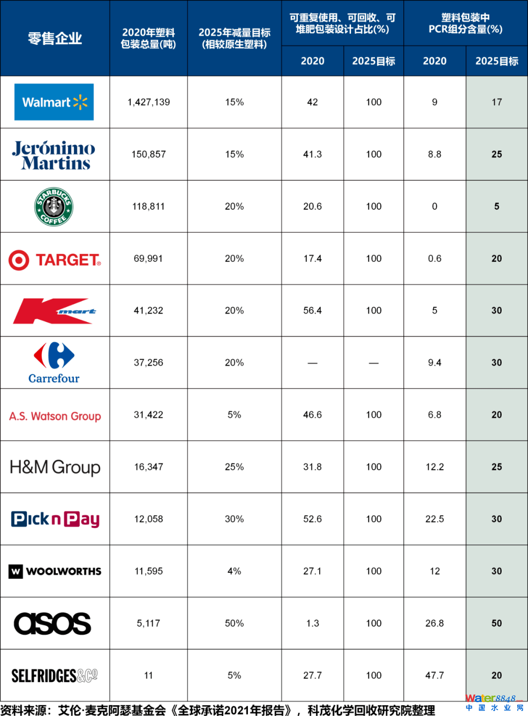 全球排名前列的零售企業(yè)做出的承諾見表2。根據(jù)承諾,到2025年,塑料包裝中要含平均約25%的PCR組分,而2020年數(shù)據(jù)為10%左右。