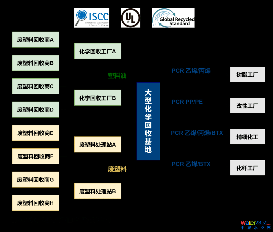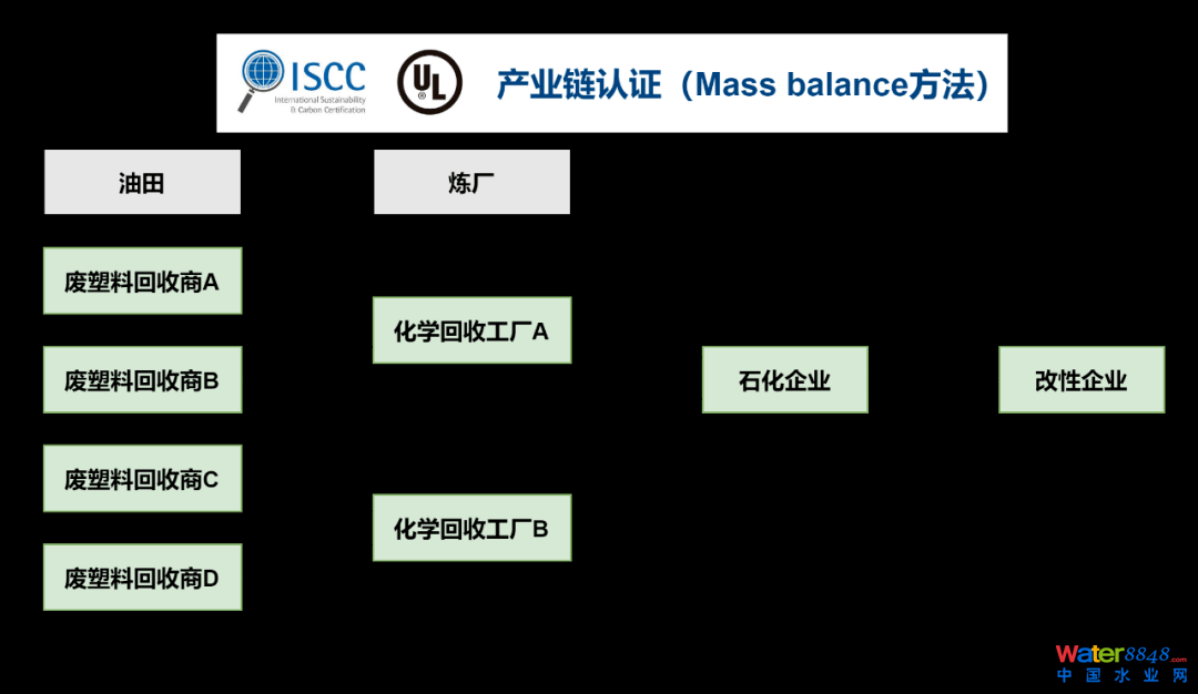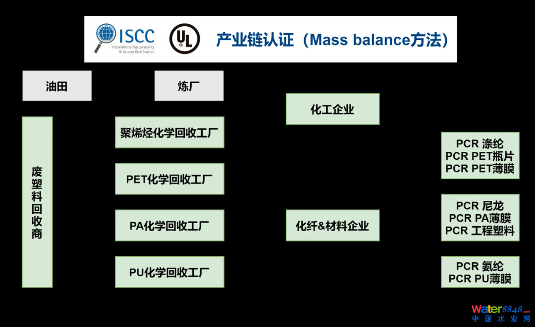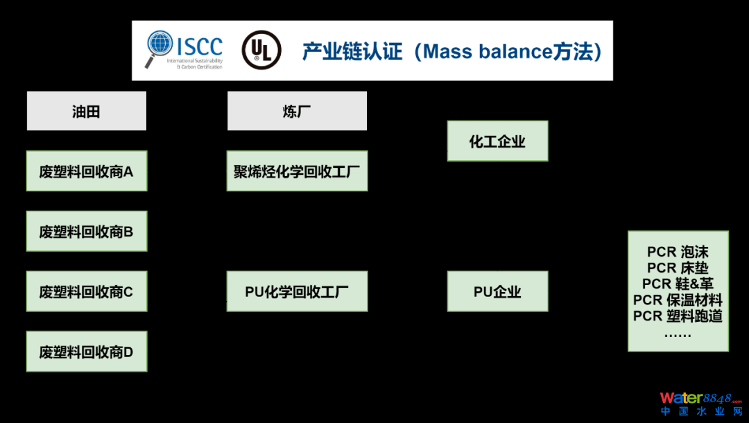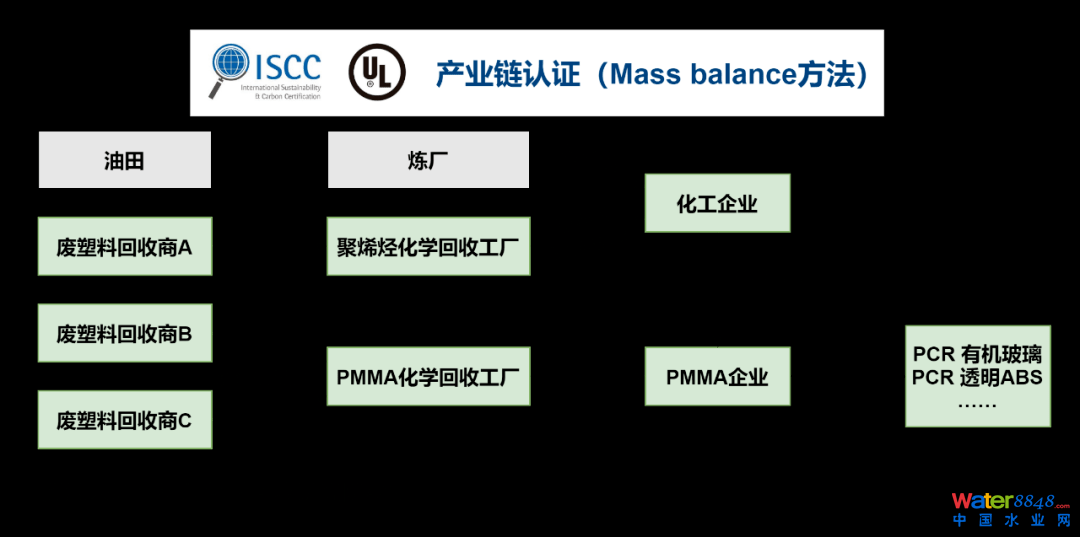 目前化工企業(yè)少有專門處理塑料油的裝置,需與原油或石腦油混合加工。數(shù)年內(nèi),化學(xué)循環(huán)樹脂的主要生產(chǎn)者還是現(xiàn)有的化工企業(yè);旌霞庸ぎa(chǎn)出PP/PE/PS等,通過Mass balance認證的方法保障PCR樹脂的可追溯性。