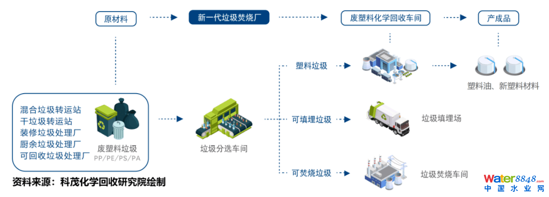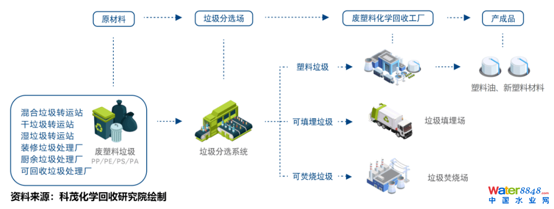 科茂化學(xué)回收研究院對廢塑料化學(xué)循環(huán)產(chǎn)業(yè)鏈的梳理見圖1。