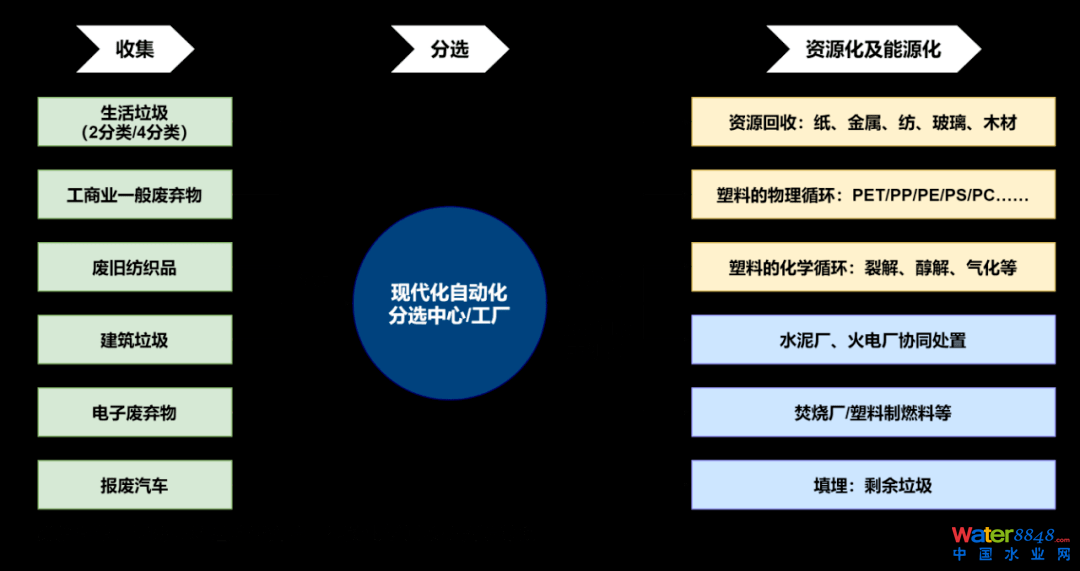 垃圾分類和環(huán)衛(wèi)一體化的深度融合使得垃圾從被丟棄到末端處置的過程連續(xù)且可控,有助于避免混收混運混合處置,為下游資源化提供穩(wěn)定的初始原料,是化學(xué)回收原料的最大潛在來源之一。