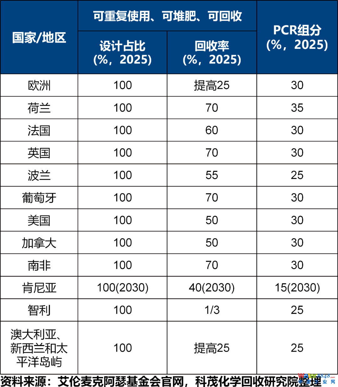 艾倫·麥克阿瑟基金會除了發(fā)起針對品牌、零售和包裝企業(yè)的全球承諾外,還發(fā)起了“全球塑料公約網(wǎng)絡(luò)”。該網(wǎng)絡(luò)由多個國家和區(qū)域組成,目標包括可重復(fù)使用、可堆肥、可回收塑料包裝設(shè)計占比、回收率以及PCR組分等,具體見表6。