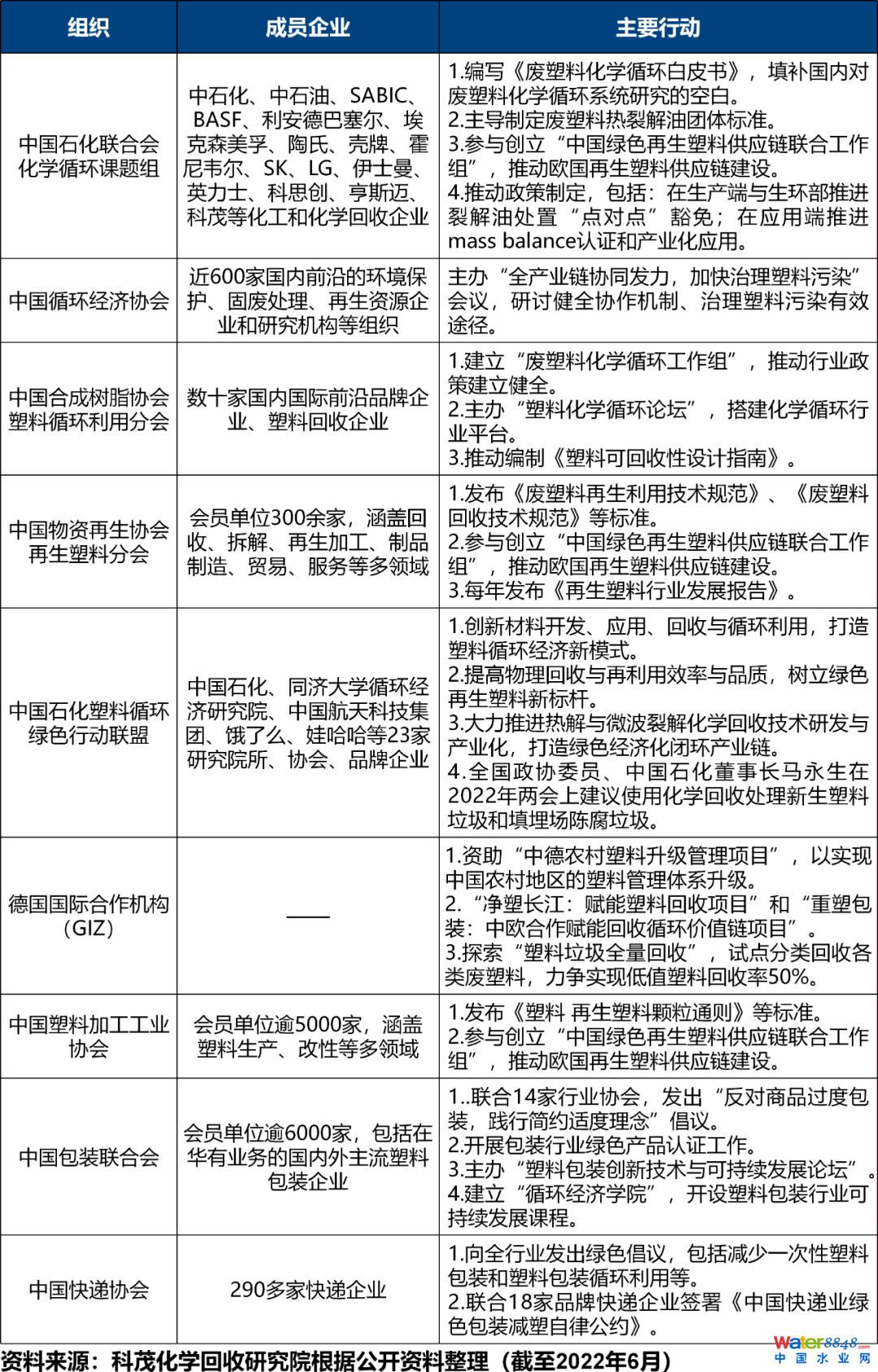 在中國,諸多組織也開始大力推動化學(xué)循環(huán),中國石油和化學(xué)工業(yè)聯(lián)合會(CPCIF)是典型代表之一,多家協(xié)會或機構(gòu)也紛紛采取行動(見表7)。