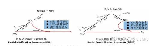 近些年來,IFAS在國(guó)內(nèi)得到新發(fā)展,在活性污泥工藝的厭氧、缺氧區(qū)投加填料,是提升生化工藝脫氮效率新嘗試,國(guó)內(nèi)有多座市政污水廠運(yùn)行,在缺氧區(qū)投加懸浮載體形成的部分主流厭氧氨氧化現(xiàn)象在國(guó)內(nèi)多座污水廠被發(fā)現(xiàn),載體表面生物膜微生物菌群結(jié)構(gòu)的微觀解析發(fā)現(xiàn),Anammox具有較高的豐度,通過生物膜Anammox過程為生化段可提供大概20%~30%的總脫氮貢獻(xiàn);與此同時(shí),生物膜脫氮過程新的生化代謝機(jī)理被進(jìn)一步揭示,基于生物膜載體為基礎(chǔ)的Anammox脫氮過程兩種工藝路線,即短程硝化-厭氧氨氧化(Partial Nitritation-Anammox, PNA)、短程反硝化-厭氧氨氧化工藝路線(Partial denitrification-Anammox, PdNA)工藝被研究和提出,即“AM-AAO”工藝構(gòu)型、PdNA-MBBR或PdNA-IFAS,這些技術(shù)路線在國(guó)內(nèi)外一些項(xiàng)目被研究、應(yīng)用和示范-。PN-A工藝主要優(yōu)勢(shì)是無需外加碳源,理論上節(jié)省60%曝氣能耗,但影響工藝運(yùn)行穩(wěn)定性的主要因素在于短程硝化的過程控制,即亞硝酸鹽的穩(wěn)定產(chǎn)生過程,其在主流城市污水處理中難以長(zhǎng)期維持穩(wěn)定的關(guān)鍵問題仍有待解決;而PdNA工藝,通過反硝化途徑產(chǎn)生NO2-,受有機(jī)底物類型影響小,相對(duì)PNA,PdNA提供了另一種穩(wěn)定產(chǎn)生NO2-的技術(shù)途徑,利用原污水中碳源(或投加一部分商業(yè)碳源)在缺氧條件下將NO3-還原為NO2-,為Anammox 菌活性維持和有效富集提供必需底物,兩種技術(shù)路線比較見圖5。