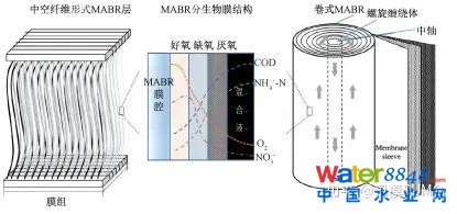 YEH 和 JENKINS等于 1978 年首次提出并構(gòu)建了MABR,用聚四氟乙烯纖維膜供氧處理人工合成污水取得很好的效果。Côté P等人1989 年提出無泡曝氣(Bubble free aeration)的概念,論證了MABR在氣體高效傳質(zhì)方面的優(yōu)勢(shì)。YAMIGAWA等在1994年證實(shí)MABR微生物膜的功能分層結(jié)構(gòu), 其研究結(jié)果表明, 硝化菌群主要聚集在靠近載體膜表面氧分壓高的附近, 而反硝化菌群主要聚集在生物膜與液相主體界面缺氧區(qū)域,這種特殊的分層結(jié)構(gòu)使MABR具有同時(shí)除碳脫氮的效果。MABR工藝主要有中空纖維和卷式膜兩種形式,主要技術(shù)優(yōu)勢(shì)是無泡曝氣帶來的低能耗;與此同時(shí),MABR獨(dú)特的透氣膜曝氣-生物膜的結(jié)構(gòu)創(chuàng)造了一個(gè)氧氣與溶解性底物在生物膜厚度上的“逆向擴(kuò)散”(counter-diffusional biofilm),這樣硝態(tài)氮與污水中碳源在最外層生物膜直接接觸,實(shí)現(xiàn)外層生物膜低碳源損耗的高效同步硝化反硝化(SND)脫氮(見圖6),MABR氧傳遞效率可以達(dá)到傳統(tǒng)微孔曝氣方式的4倍。