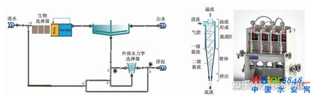 基于間歇流AGS工藝的一些不足,近些年來,連續(xù)流污泥顆粒化工藝及控制和實(shí)現(xiàn)手段相關(guān)研究與應(yīng)用得到重視,尤其是近五年來,基于連續(xù)流工藝的致密活性污泥(Densified Activated Sludge, DAS)工藝在美國(guó)多個(gè)項(xiàng)目進(jìn)行大規(guī)模生產(chǎn)性試驗(yàn)研究并得到示范應(yīng)用,證明了連續(xù)流AGS & DAS技術(shù)的優(yōu)越性,尤其是與高級(jí)生化過程控制系統(tǒng)的結(jié)合。連續(xù)流AGS & DAS主要技術(shù)手段是采用生化動(dòng)力學(xué)生物選擇器及水力選擇器組合形式,來篩選高密度重質(zhì)顆粒化污泥。具體而言,通過基于微生物生化代謝動(dòng)力學(xué)的“快食-饑餓”(feast/famine)兩段式生化反應(yīng)條件控制,并采用在線(混合液線)或離線(污泥回流線)水力學(xué)分離器以篩選密度大、沉速快的顆粒污泥,輕質(zhì)污泥通過水力分離器上部溢流部件以剩余污泥形式撇除系統(tǒng)之外,加裝水力旋流器后的活性污泥生化系統(tǒng),SVI可以顯著改善,提升二沉池的泥水分離效果,處理能力因而可以得到同步提升,DAS工藝原理示意見圖9。