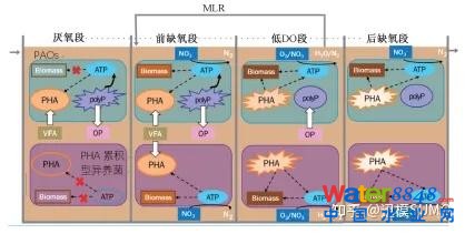 傳統(tǒng)構(gòu)型活性污泥工藝如AAO,由于設(shè)計(jì)參數(shù)與實(shí)際情況(水量、水質(zhì))可能出現(xiàn)的偏離、以及運(yùn)行過程各工藝段固定池容的“物理剛性”約束,運(yùn)行過程不能根據(jù)進(jìn)水水質(zhì)特性進(jìn)行實(shí)時(shí)調(diào)整各工藝段,大量的碳源被好氧過程過度消耗,導(dǎo)致進(jìn)水用于反硝化過程的碳源利用率實(shí)則較低。傳統(tǒng)的工藝設(shè)計(jì)構(gòu)型和運(yùn)行過程控制有利于PHA在PAOs和GAOs中的積累,卻嚴(yán)重限制和削弱了DPAOs和DGAOs這類功能菌的PHA驅(qū)動(dòng)型反硝化(PHA-Driven Denitrification)潛力,理想的反硝化過程設(shè)計(jì)應(yīng)考慮到不同生態(tài)和代謝特征微生物在胞內(nèi)碳源的形成和高效利用優(yōu)勢(shì)和差異,圖7顯示了低DO操作下PAH驅(qū)動(dòng)脫氮工藝設(shè)計(jì)的概念框架。