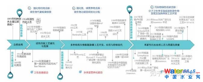 回顧污水處理工藝技術(shù)的百余年發(fā)展歷史,隨著對(duì)環(huán)境問題的認(rèn)知轉(zhuǎn)變,污水處理也逐漸實(shí)現(xiàn)了從最初的城鎮(zhèn)衛(wèi)生工程向環(huán)境工程及環(huán)境水質(zhì)學(xué)方向的轉(zhuǎn)變?傮w可大致劃分為四個(gè)階段:活性污泥工藝誕生之前采用土壤過濾或滴濾池工藝階段、活性污泥發(fā)展初期以耗氧有機(jī)物為去除目標(biāo)階段、延續(xù)至今的污水生物除磷脫氮技術(shù)快速發(fā)展各種經(jīng)典活性污泥工藝百花齊放階段,以及近十年來以綠色低碳、高效集約為基本特征的革新性污水生化處理工藝持續(xù)開發(fā)與應(yīng)用階段,不同技術(shù)發(fā)展階段標(biāo)志性處理工藝發(fā)明或提出,及國(guó)內(nèi)外污水處理一些重要里程碑式事件按時(shí)間軸展示于圖1。