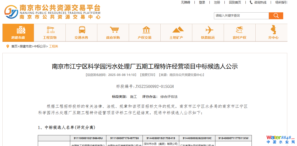 超 10 億!南京江寧科學(xué)園污水處理廠五期工程特許經(jīng)營(yíng)項(xiàng)目中標(biāo)候選人公示,中鐵、中建等央企國(guó)企入圍