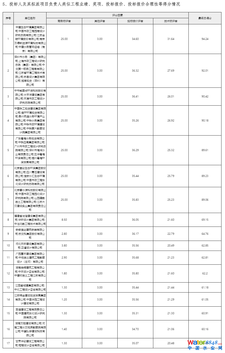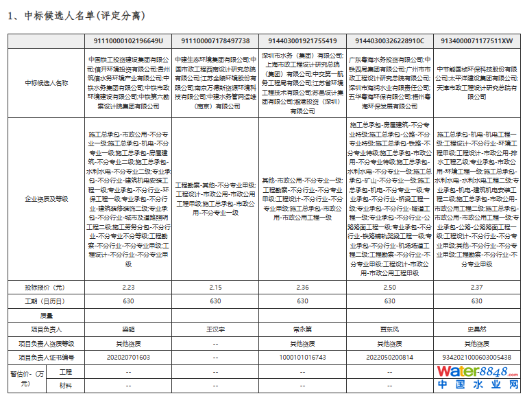 中標(biāo)候選人名稱:深圳市水務(wù)(集團(tuán))有限公司、上海市政工程設(shè)計(jì)研究總院(集團(tuán))有限公司、中交第一航務(wù)工程局有限公司、江蘇省環(huán)境工程技術(shù)有限公司、蘇邑設(shè)計(jì)集團(tuán)有限公司、湘港投資(深圳)有限公司;