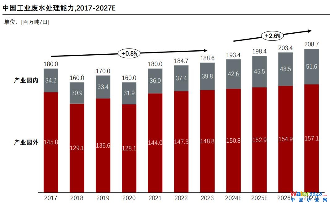 產(chǎn)業(yè)園內(nèi)工業(yè)廢水處理能力在2023年占比為21.1%,而2017年為19.0%,預(yù)計到2027年該比例將增至24.79%。